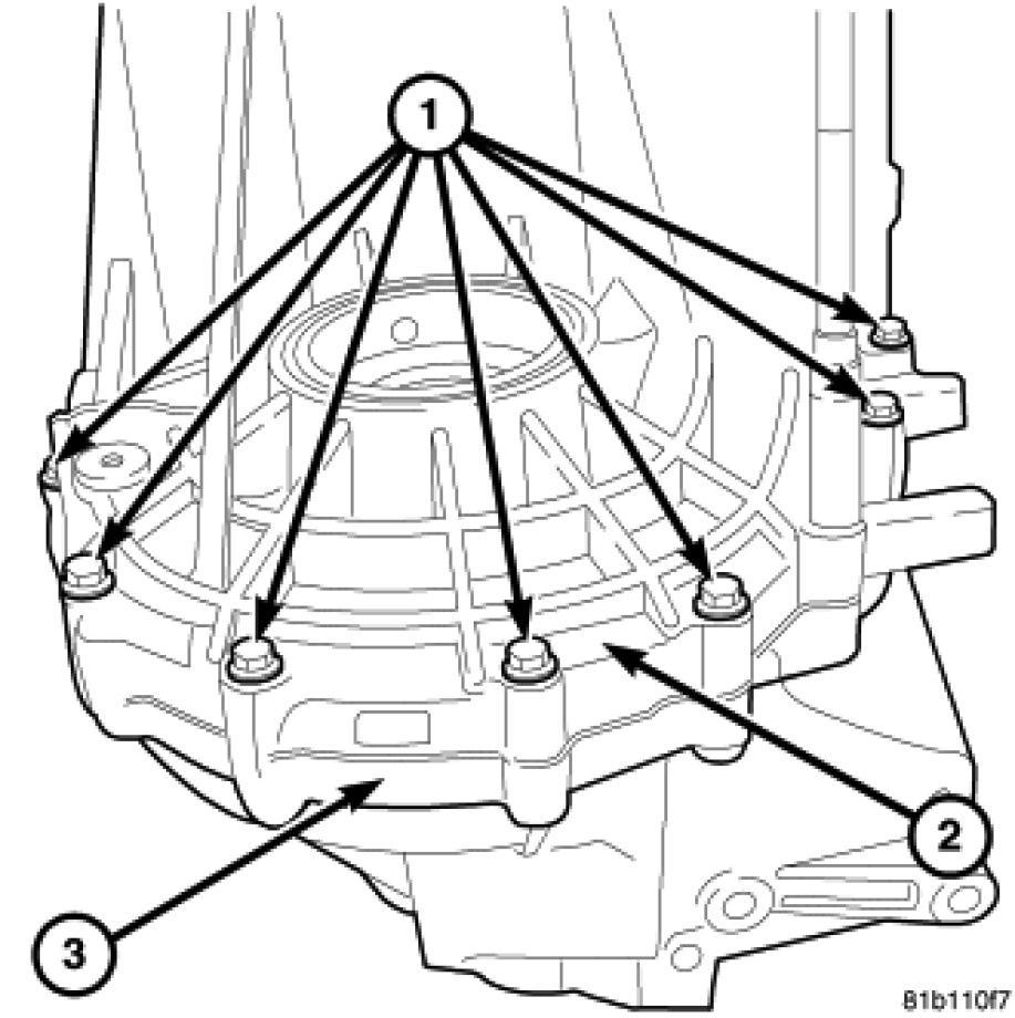 17. Remove the bolts (1) holding the transmission case (2) to the clutch housing (3) from the transmission case side.