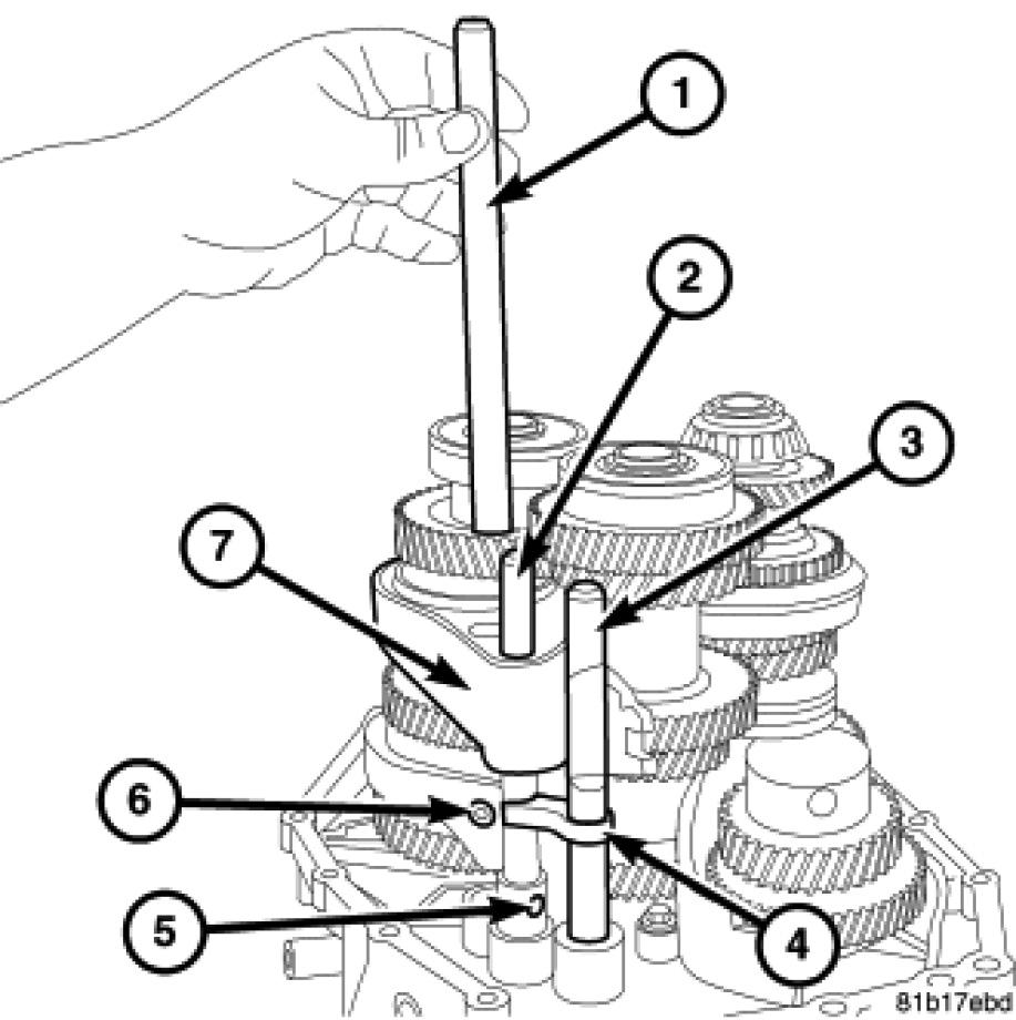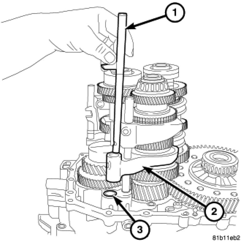47. Using a hammer and a punch (3) remove the roll pin at the third and fourth gear shift rail.