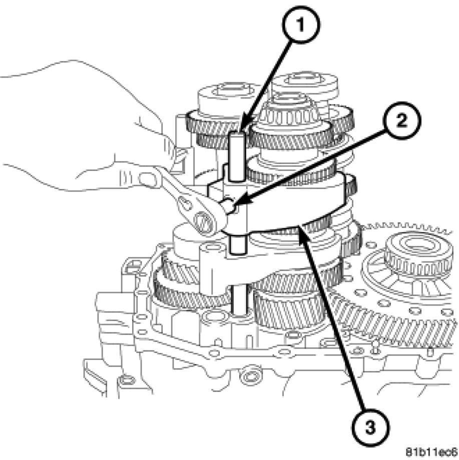 26. Remove fifth and sixth gear shift rail detent spacer (3) and spring (2).