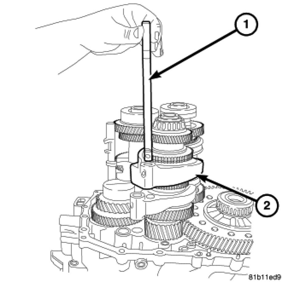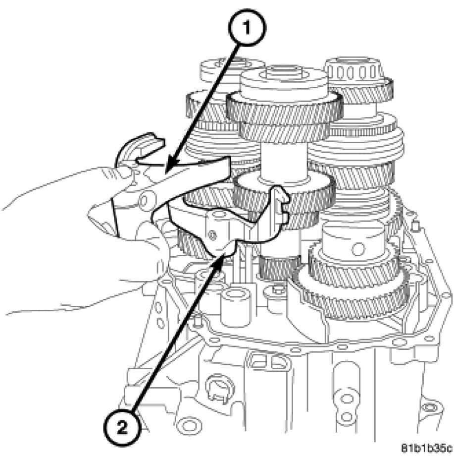 41. Remove the fifth and sixth gear shift rail (1) from case and shift fork (2).