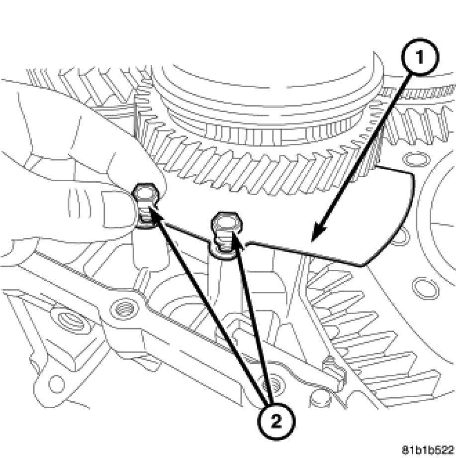 55. Remove the reverse idler gear (1) hold down bolt (2).