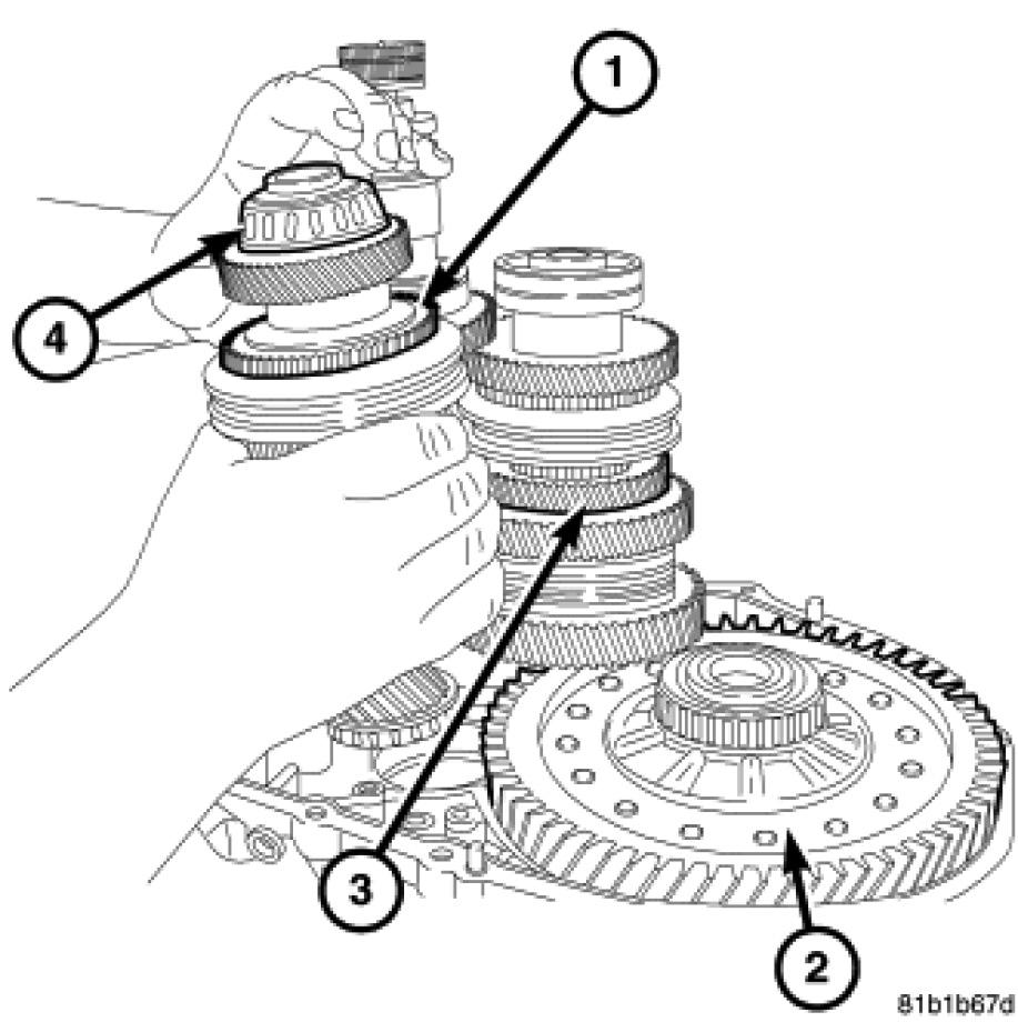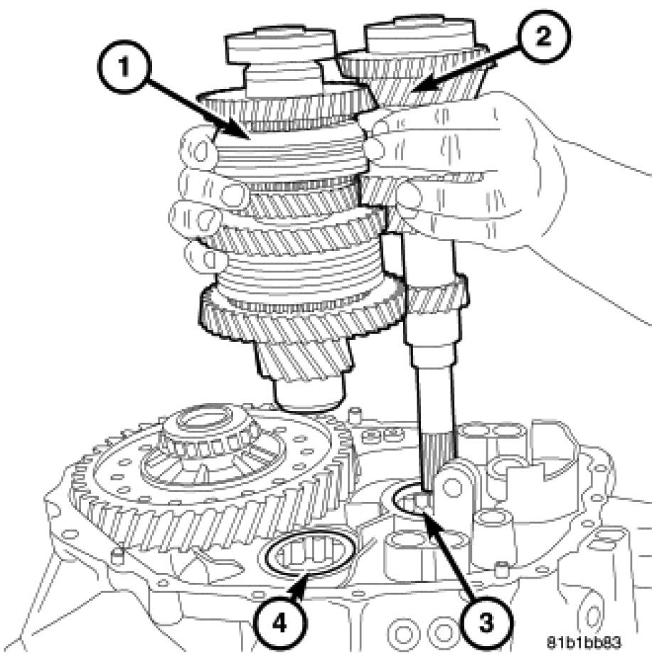 59. Remove the output shaft (2) hold down bolt (4) from the case.