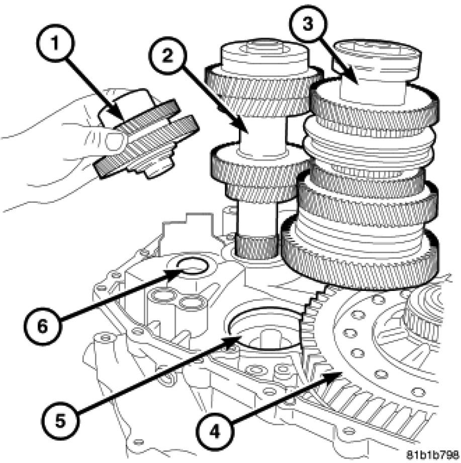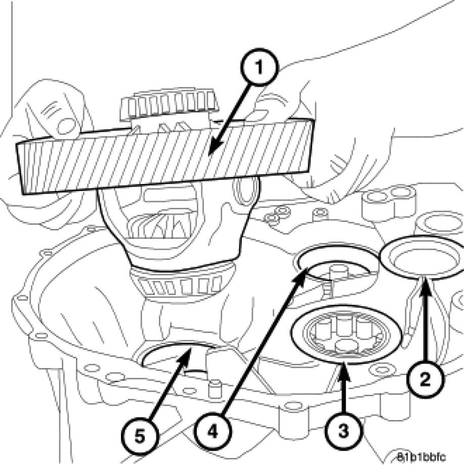 61. Remove the differential (1) from the case (5).
