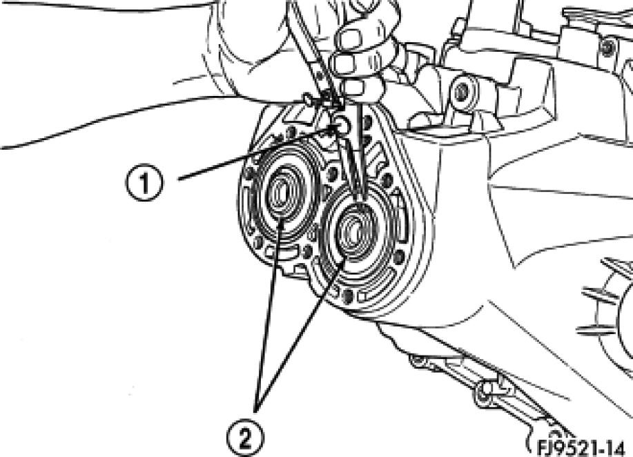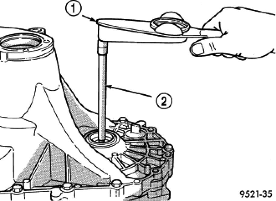 8. Remove case bolts. Remove clutch bellhousing differential bearing cup. Install shim(s) selected in.Then press the bearing cup into clutch bellhousing.