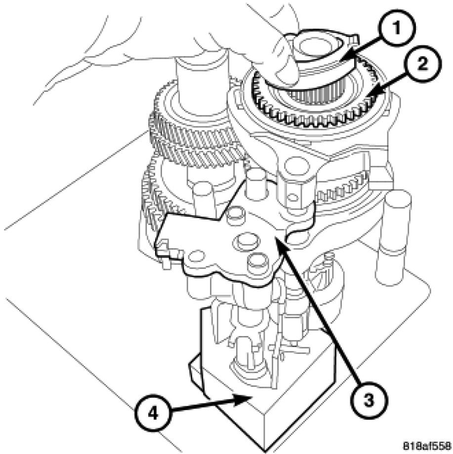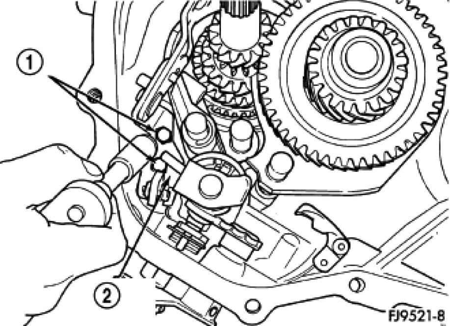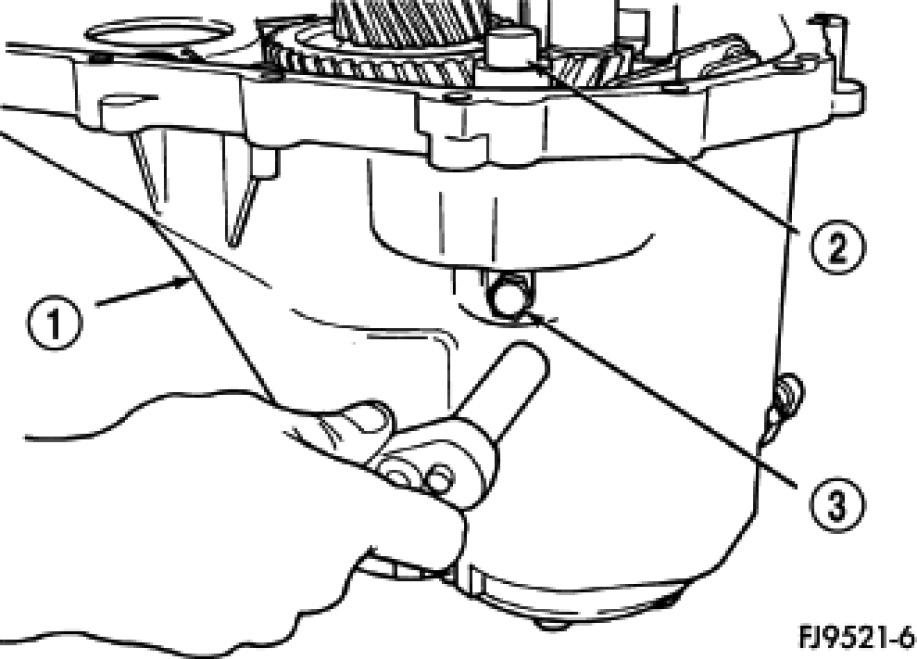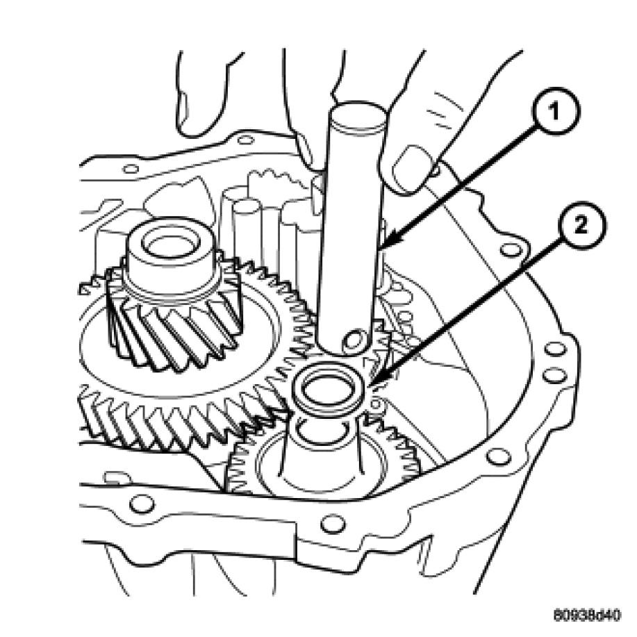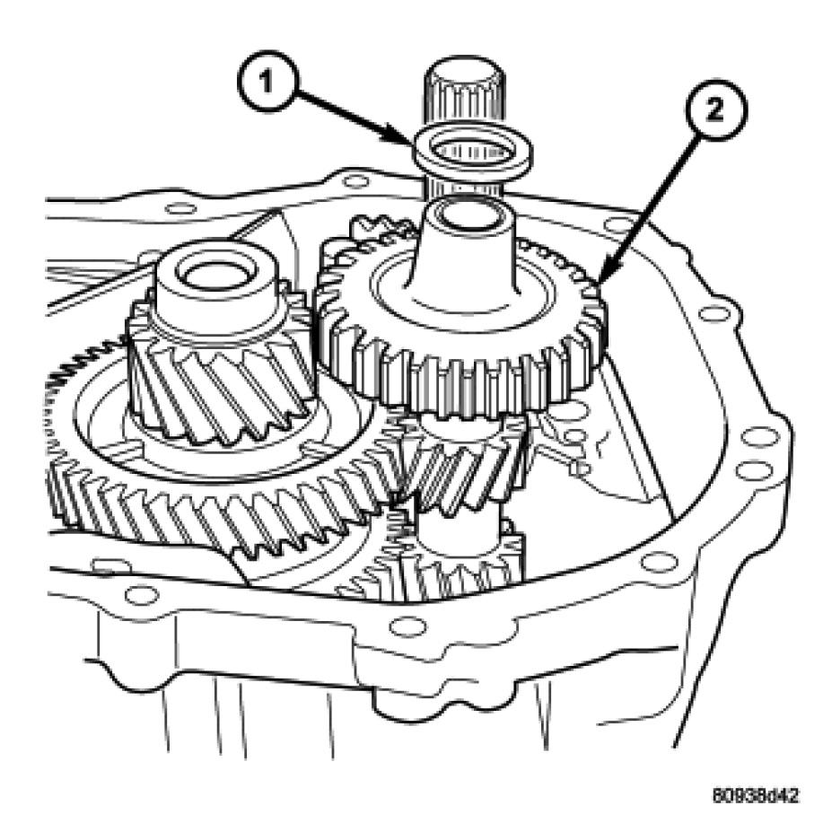 17. Install reverse idler gear (2) and spacer (1).
