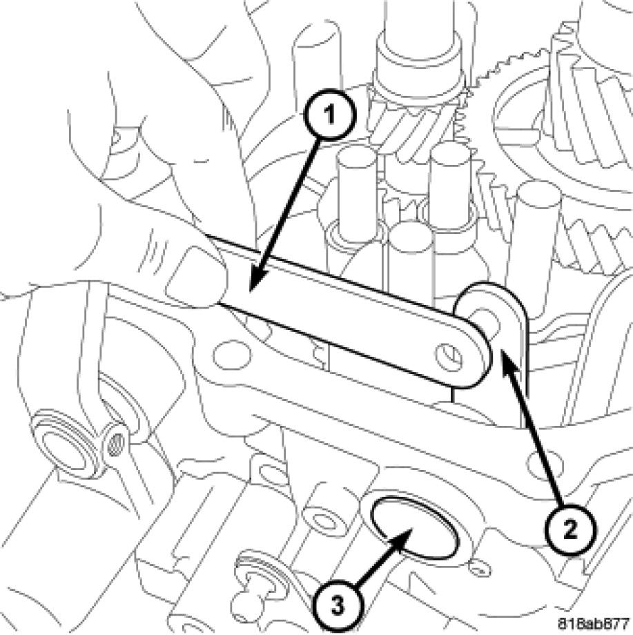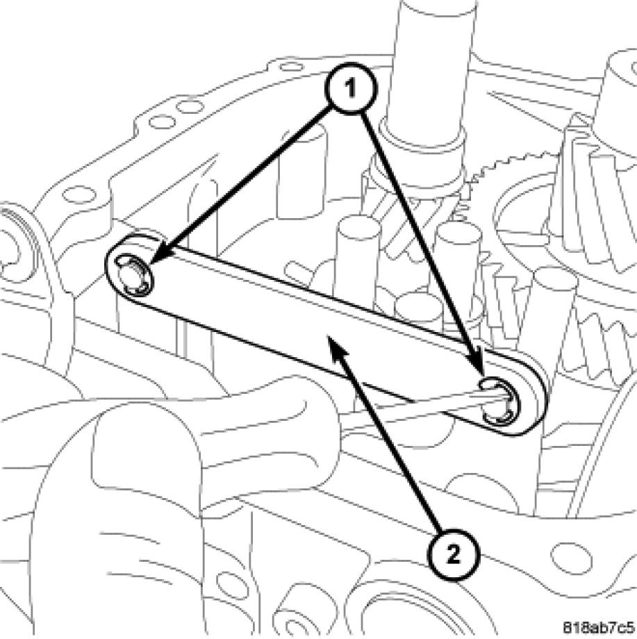 19. Install bolt into reverse idler shaft (2) and tighten to 26 Nm (19 ft. lbs.).