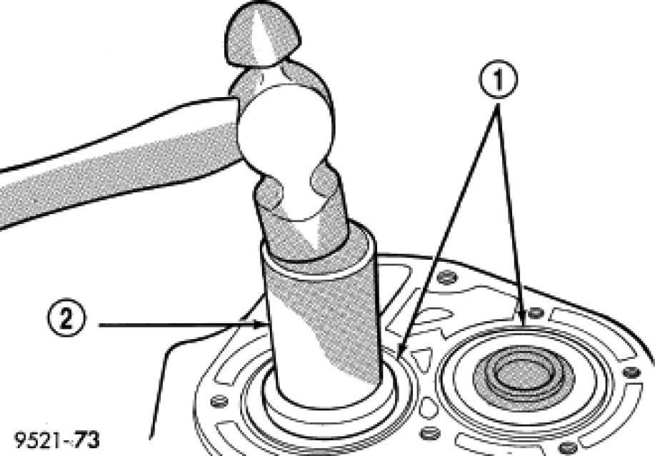 9. Position input and output bearings (1) on the shafts. Using Seal Installer C-4992-1 (2), install input and output shaft bearings (1) until they bottom into the case and against the shafts.
