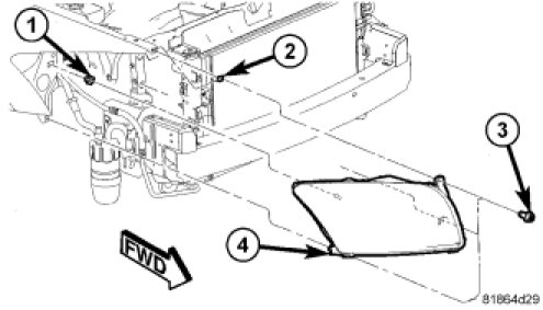 5. Install the fascia that was loosened on the repair side. One bolt holding the fascia to the fender at the wheel well opening, the splash shield to fascia screws, and the fasteners along the radiator closure panel.