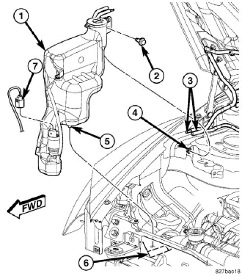 3. Install and tighten the screw (2) that secures the mounting tab on the back of the reservoir filler neck to the bracket (4) on the forward side of the right front strut tower.