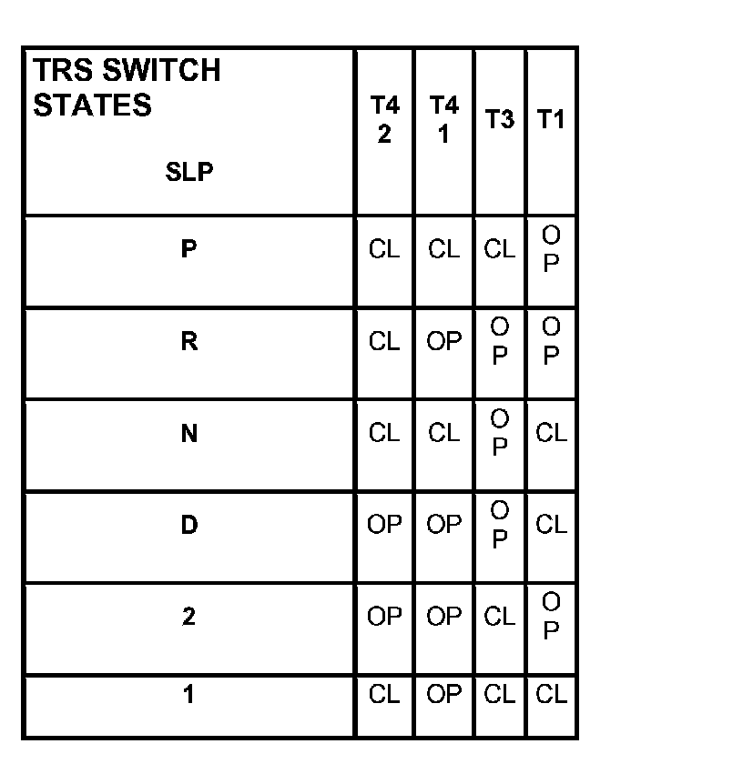The Transmission Range Sensor (TRS) communicates shift lever position (SLP) to the TCM as a combination of open and closed switches. Each shift lever position has an assigned combination of switch states (open/closed) that the TCM receives from four sense circuits. The TCM interprets this information and determines the appropriate transmission gear position and shift schedule.