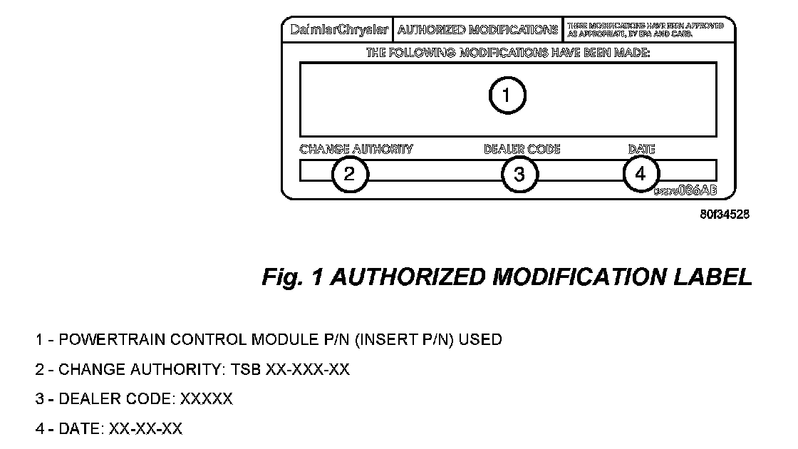 8. Type the necessary information on the "Authorized Modification Label" p/n 04275086AB and attach near the VECI label (Fig. 1).