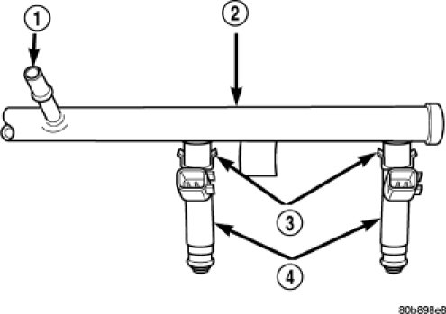 2. Install injector(s) (4) and injector clip(s) (3) to fuel rail.
