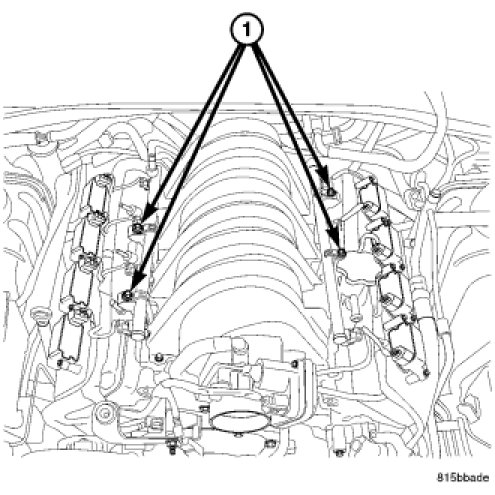 7. Install 4 fuel rail holddown clamps and 4 mounting bolts (1). Tighten fuel rail mounting bolts to 11 Nm (100 in. lbs.)