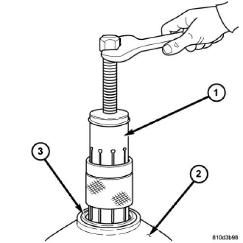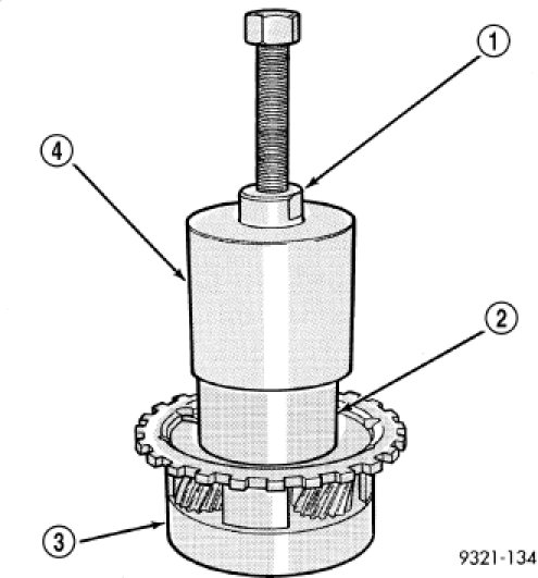 NOTE: Verify that Compressor Tool 5058A (1) is centered properly over the 2/4 clutch retainer (4) before compressing. If necessary, fasten the Compressor Tool 5058A bar to the bellhousing flange with any combination of locking pliers and bolts to center the tool properly.