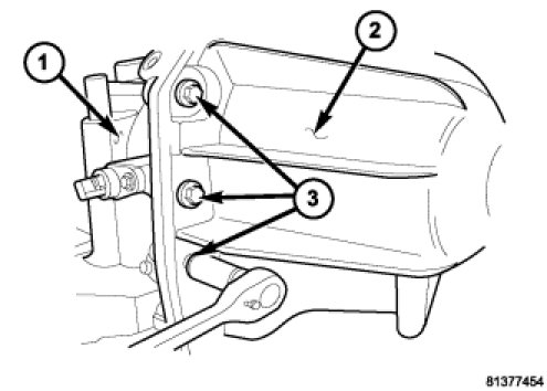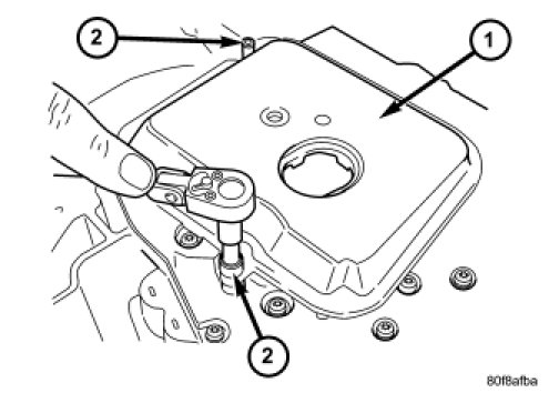 19. Remove the transmission oil pan bolts (2).