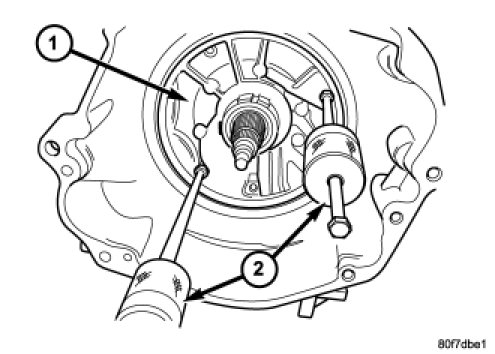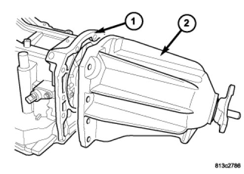 14. Remove the extension (2) housing from the transmission case. There are two pry slots located near the bottom corners of the housing for separating the housing from the transmission case.