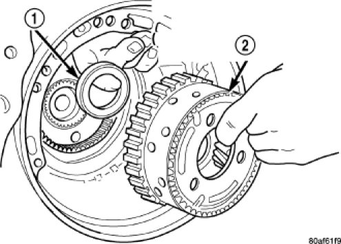 42. Remove the rear sun gear (2) and #7 needle bearing (1).