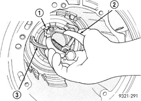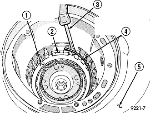 43. Install and load Tool 5058A to remove the 2/4 clutch retainer snap ring (3).