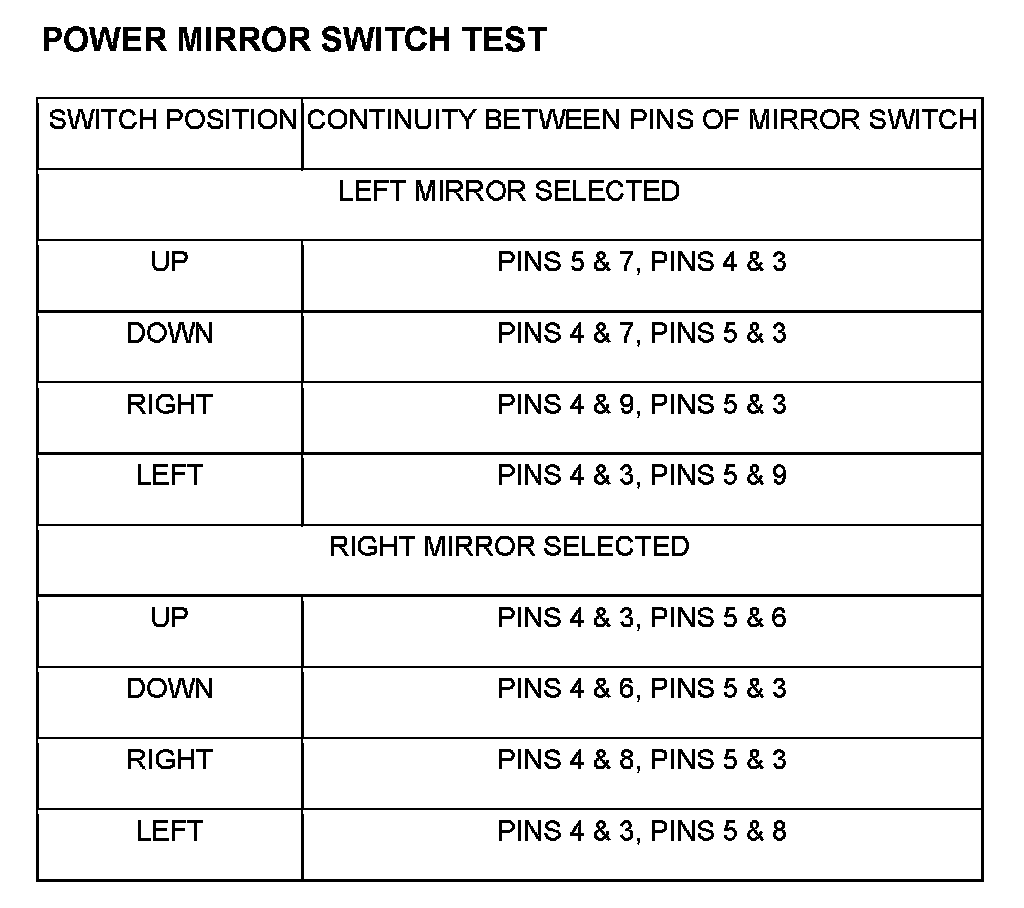 4. Test the switch continuity. refer to the Power Mirror Switch Tests chart to determine if the continuity is correct for the switch in each switch position. If not OK, replace the inoperative switch as required.