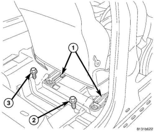 3. Remove the left side front seat two rear attaching bolts (1) and (2).