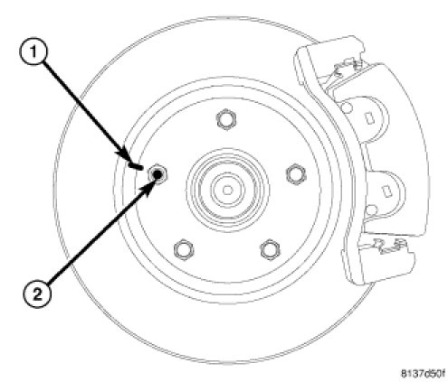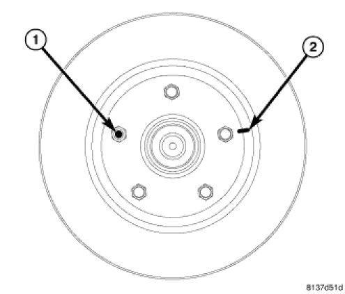 11. If hub runout does not exceed this specification, install original rotor back on hub, aligning chalk mark on rotor (2) with a wheel mounting stud, two studs apart from original stud (1).