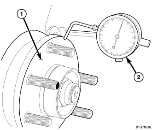 Rotor thickness variation measurements should be made in conjunction with measuring runout. Measure thickness of the brake rotor (2) at 12 equal points around the rotor braking surface with a micrometer (1) at a radius approximately 25 mm (1 inch) from edge of rotor. If thickness measurements vary beyond the specification listed in the specification table.