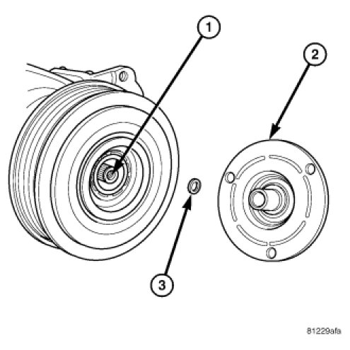 5. If the original clutch plate (2) and pulley and bearing assembly are to be reused, reinstall the original shim(s) (3) onto the compressor shaft (1). If a new clutch plate and pulley and bearing assembly are being used, install a trial stack of shims 2.54 mm (0.010 in.) thick onto the compressor shaft.