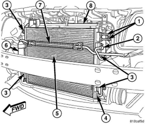 9. Connect the automatic transmission cooler lines to the cooler ports at the top of the A/C condenser.