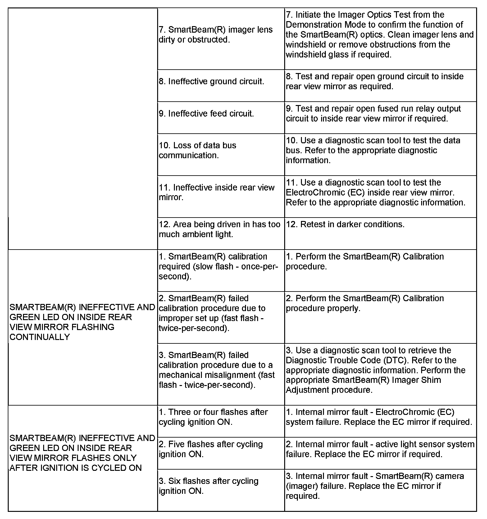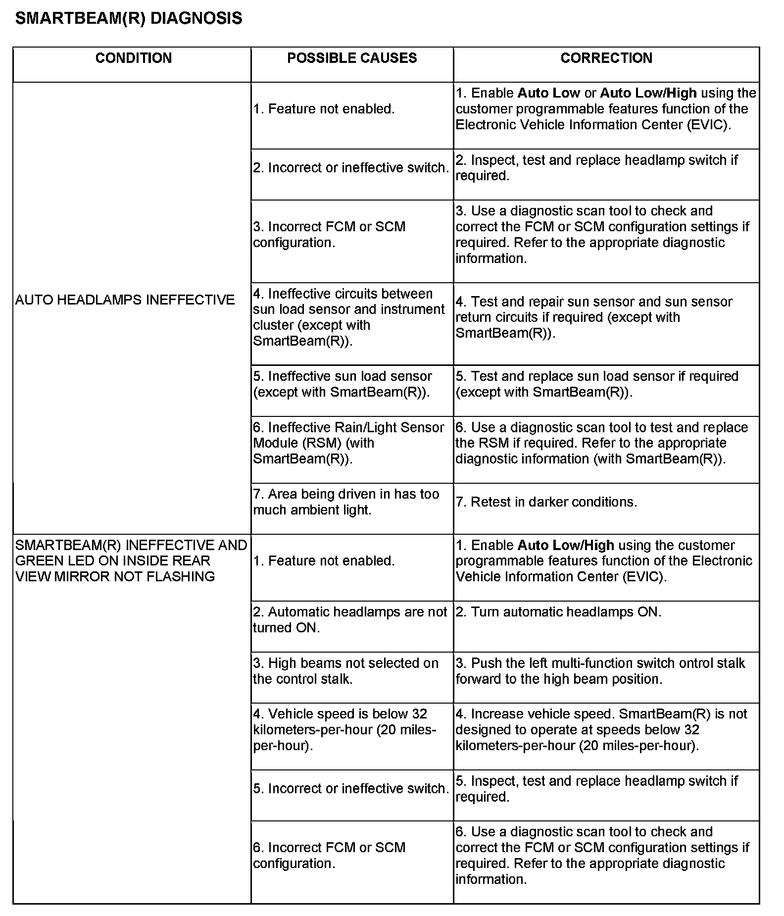 NOTE: For SmartBeam(R) to operate, the vehicle must have the appropriate headlamp switch installed, the high beam select switch pushed forward, and the Auto Low/High option must be enabled using the customer programmable features function of the Electronic Vehicle Information Center (EVIC). Also, both the Front Control Module (FCM) and the Steering Control Module (SCM) must be properly configured for the automatic headlamps option using a diagnostic scan tool. Refer to the appropriate diagnostic information.