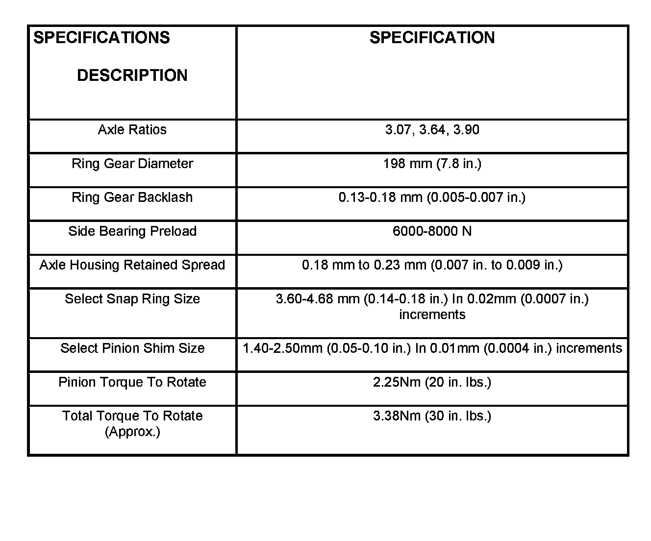 SPECIFICATIONS - 198 RII AXLE