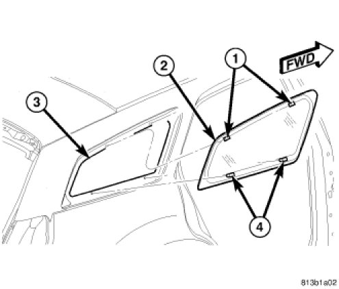 CAUTION: Roll down the left and right front door glass and open the liftgate glass before installing quarter glass to avoid pressurizing the passenger compartment if a door is slammed before urethane is cured. Water leaks can result.