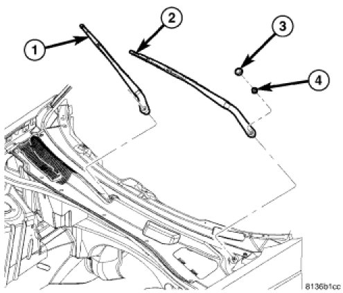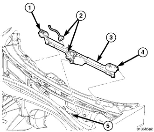 5. Remove the two retaining bolts (1 and 4) and remove wiper module (3) from vehicle.