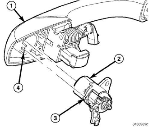 2. Align the lock cylinder in the handle by engaging the tab (3) on the outer circumference of the cylinder in the slot of the tab (4) on the wall of the handle cavity.
