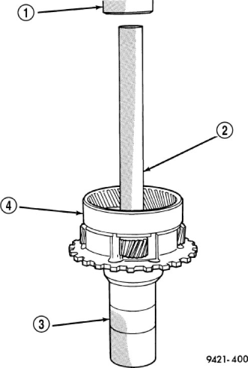 17. Install output shaft/rear carrier into rear bearing. The shaft must be pressed into position. Use special tool MD-998911 (Disc) (2) and C- 4171 and C4171-2 (Handle) (1) to press shaft into rear bearing.