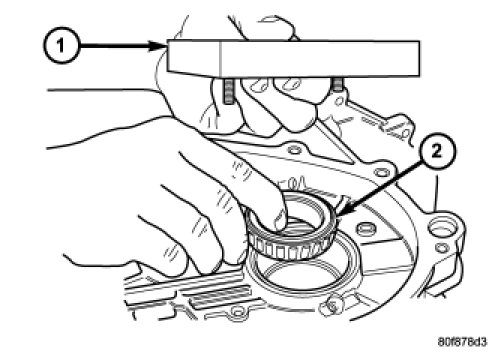 66. Install output shaft bearing in the rear transmission housing. Using Bearing Installer 9287 (1), install the output shaft bearing (2) into the transmission housing. The closed side of the plastic cage must point towards the transmission.