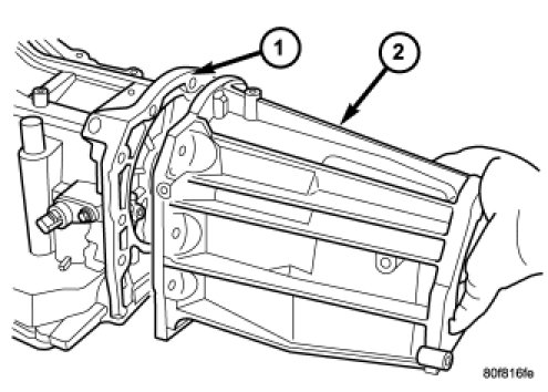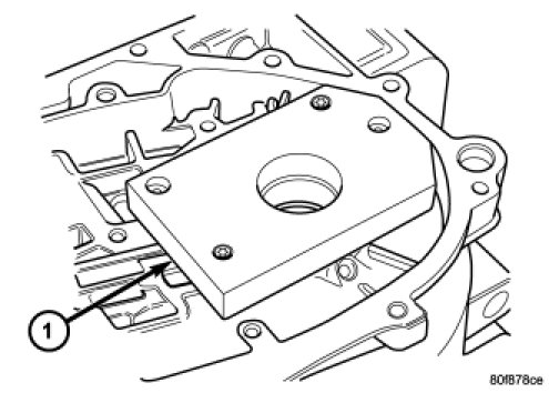 61. Install transmission oil pan (1) with a bead of Mopar(R) ATF RTV.