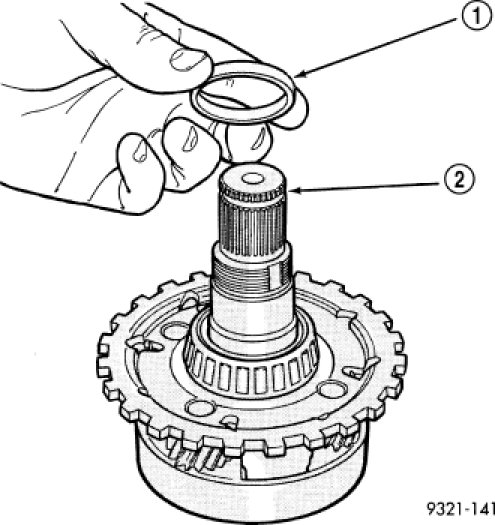 36. Install the #7 needle bearing (1) to the rear sun gear (2). The number 7 needle bearing has three antireversal tabs and is common with the number 5 and number 2 position. The orientation should allow the bearing to seat flat against the rear sun gear. A small amount of petrolatum can be used to hold the bearing to the rear sun gear.