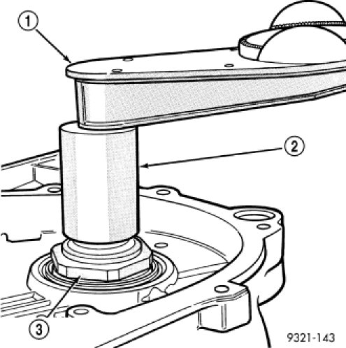 78. Press downward on the staking tool (1) until the staking pin (3) contacts the output shaft nut flange (2).