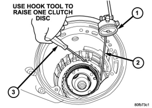 35. Measure 2/4 clutch clearance: Set up dial indicator (1) as shown. Press down clutch pack with finger and zero dial indicator. Record measurement in four (4) places and take average reading. The 2/4 clutch pack clearance is 0.76 to 2.64 mm (0.030 to 0.104 inch). If not within specifications, the clutch is not assembled properly or is excessively worn. There is no adjustment for the 2/4 clutch clearance.