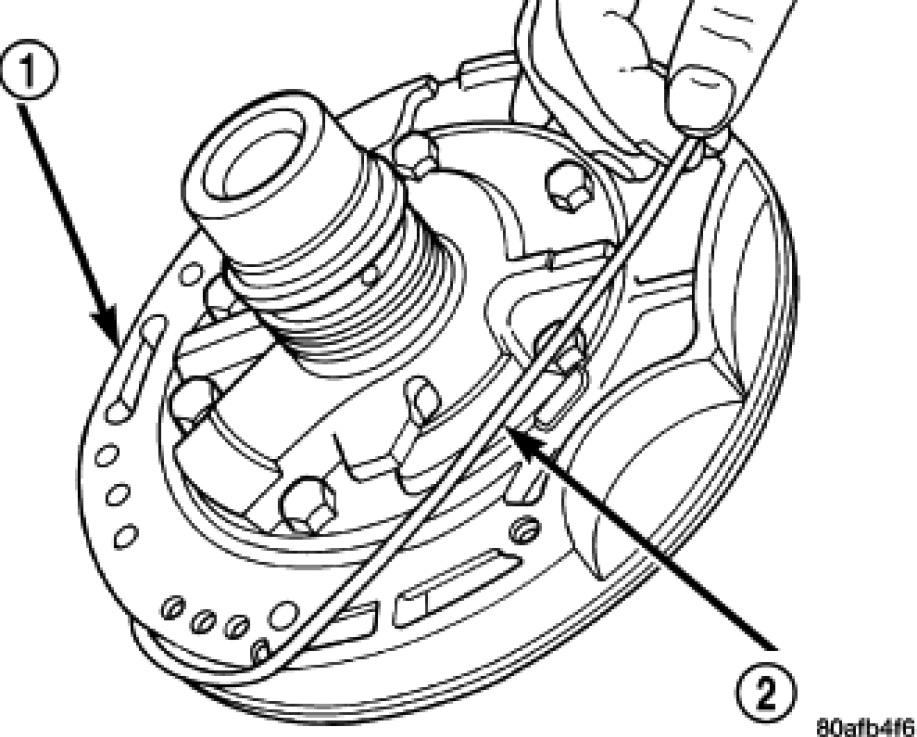 43. Remove the oil pump O-ring (2) and install oil pump and gasket to transmission. Use screw-in dowels or phillips-head screwdrivers to align pump to case. Be sure to reinstall O-ring on oil pump after selecting the proper No. 4 thrust plate.