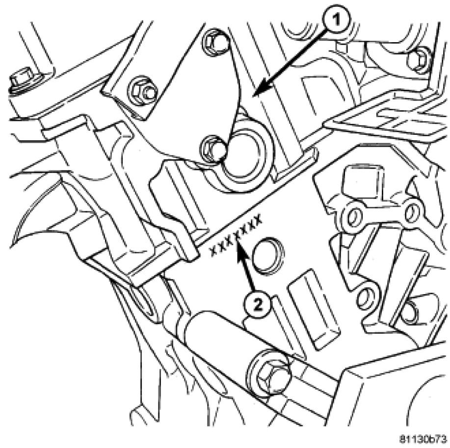 The engine identification number (2) is located on the rear of engine block just below the left cylinder head (1).