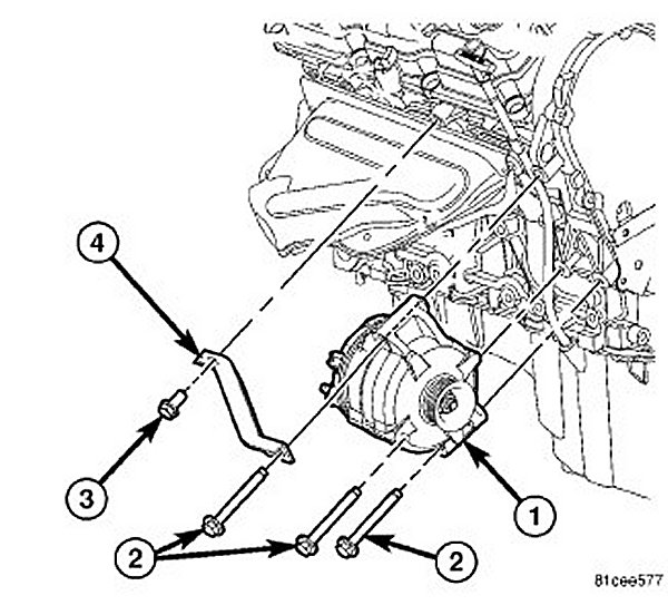 28. Position the generator bracket (4) and install the bracket bolt (3). Tighten the generator mounting bolt (2) to 65 Nm (48 ft.lbs.) and tighten the generator bracket bolt (3) 54 Nm (40 ft.lbs.).
