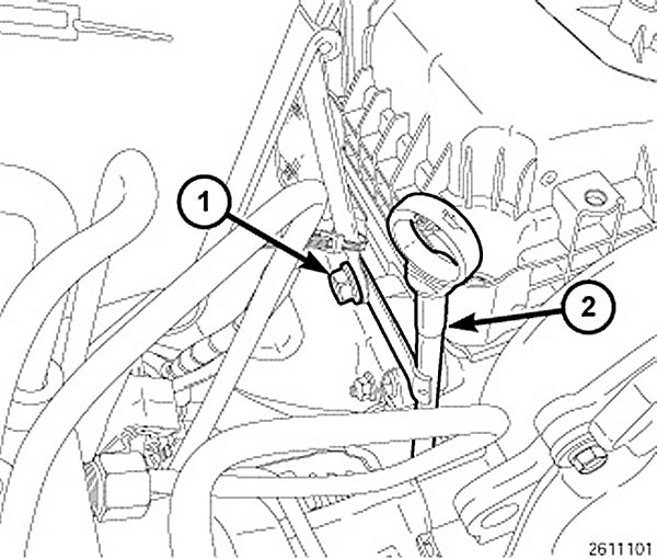 27. Install the engine oil level indicator tube (2) and tighten the retaining bolts (1) to 12 Nm (105 in.lbs.).