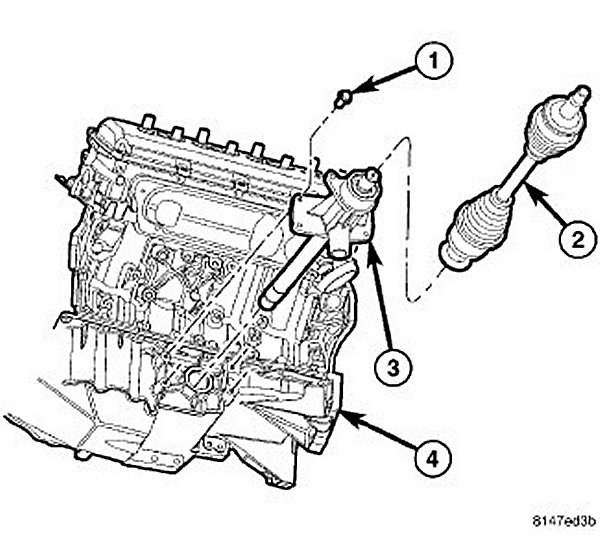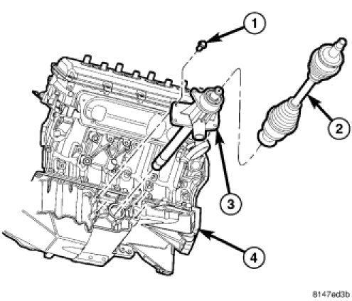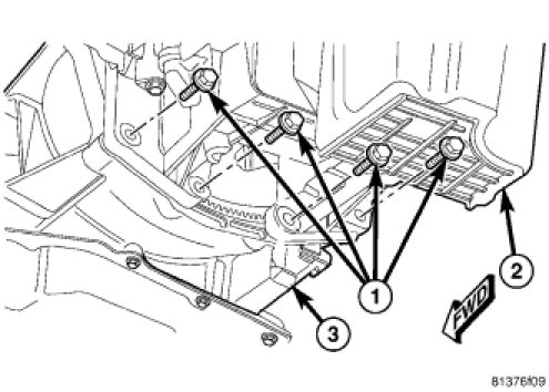 13. Install the front drive axle housing (3). Tighten mounting bolts to oil pan to 65 Nm (48 lbs. ft.).