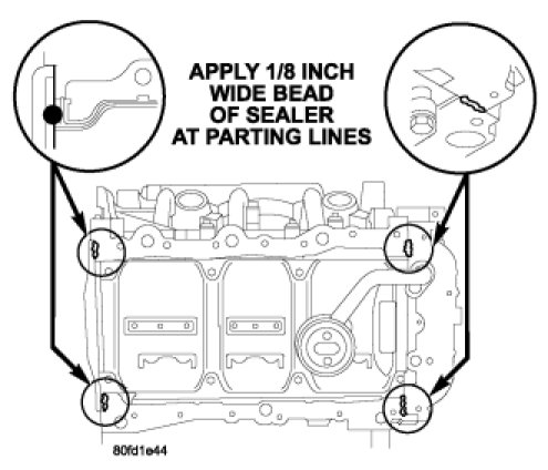 2. Apply a 1/8 inch bead of Mopar(R) Engine RTV GEN II at the parting line of the oil pump housing and the rear seal retainer.
