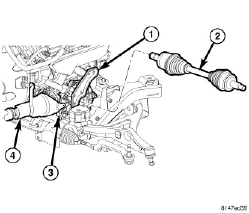 21. Install the left front drive axle intermediate shaft housing (3) and support bracket.