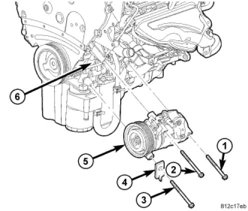 1. If the A/C compressor (5) is being replaced, the refrigerant oil in the old compressor must be first drained and measured. Then the oil in the new A/C compressor must be drained. Finally, the new compressor must be refilled with the same amount of new refrigerant oil that was drained out of the old compressor. When replacing multiple A/C system components, refer to the Refrigerant Oil Capacities chart to determine how much oil should be added to the refrigerant system. Use only refrigerant oil of the type recommended for the A/C compressor in the vehicle.