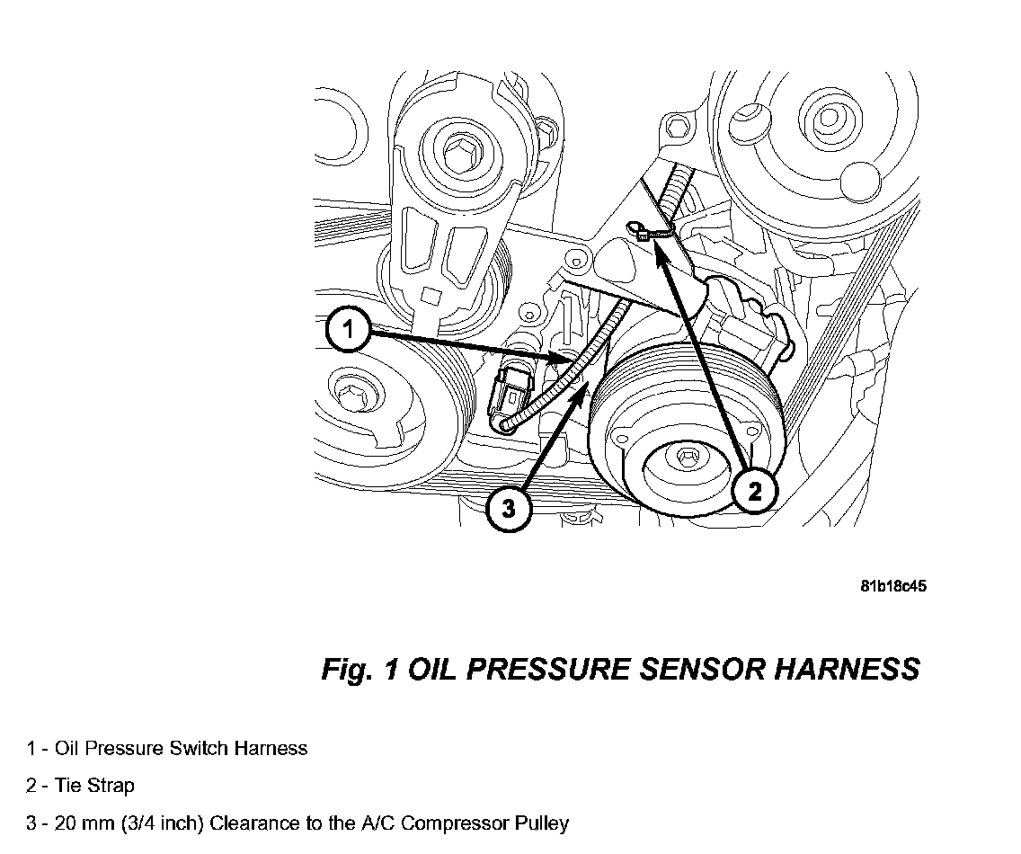 2. Route the oil pressure switch harness at least 20 mm (3/4 inch) away from the A/C compressor pulley and install the tie strap, p/n 04856501, around the harness and through the hole in the A/C compressor bracket as shown (Fig. 1).