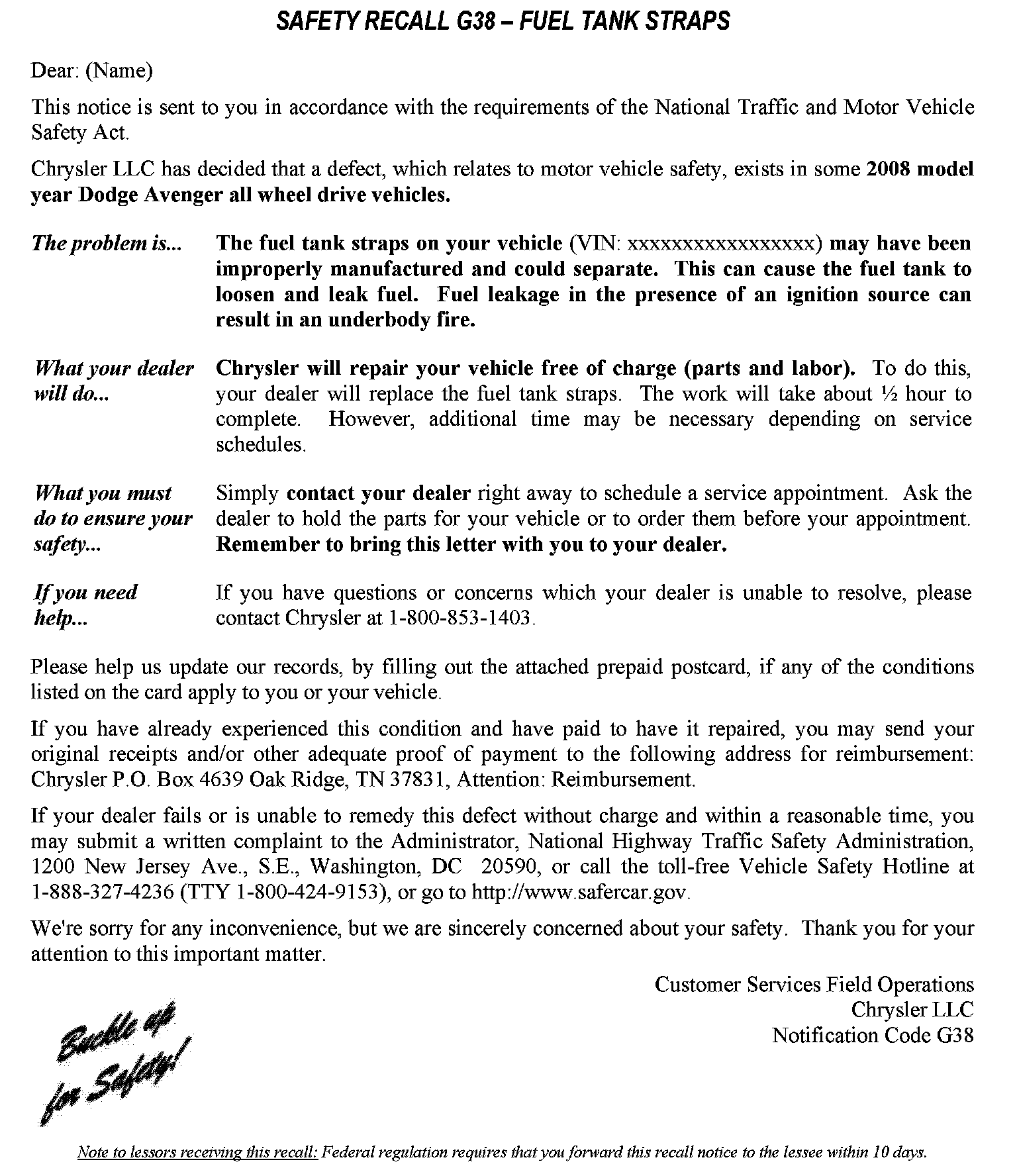 Recall - Fuel Tank Strap Replacement