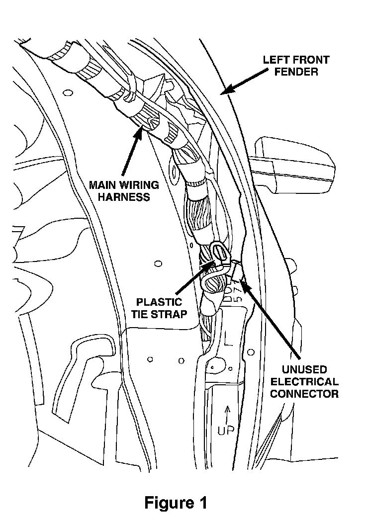 6. Cut off and discard the plastic tie strap that holds the 6-cavity unused electrical connector to the main wiring harness (Figure 1).